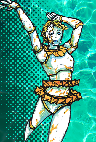 Once a graceful ballerina, Clara made a dark deal that left her trapped in a body of porcelain. Over the years, her once-perfect form has cracked, with pieces of her missing, but where there are gaps, golden seams now fill in the cracks. Clara’s delicate exterior hides a dangerous edge—though she may look fragile, her movements are swift, sharp, and precise. As second-in-command of The Bullies, Clara often watches over the beach from the arcade terrace, her silent, cracked face betraying none of the power she wields. There’s a haunting beauty to her form, but don’t be fooled—those cracks hold stories of broken promises and shattered dreams. Cross Clara, and you might find yourself dancing on the edge of a nightmare.